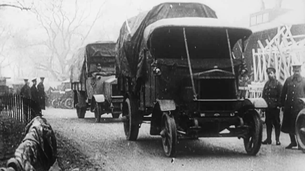 Tommy's Christmas parcels are despatched to the Front in a fleet of trucks.