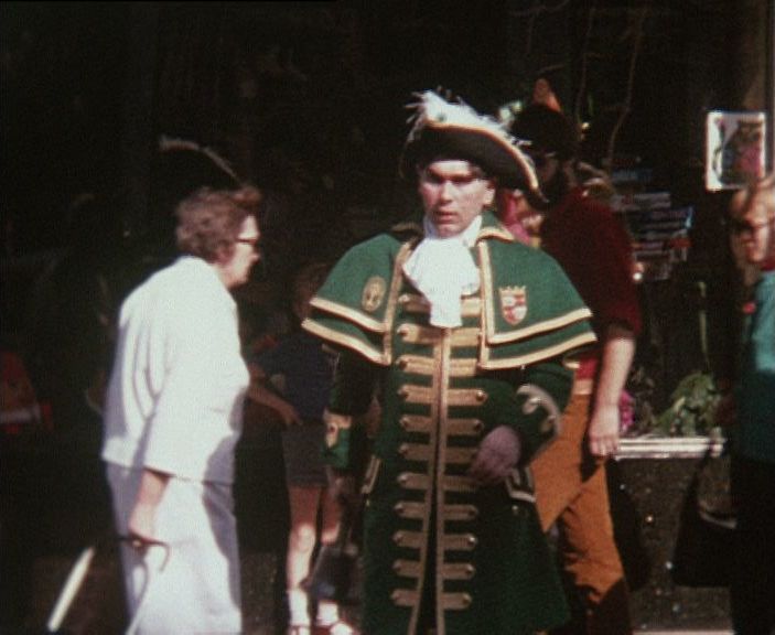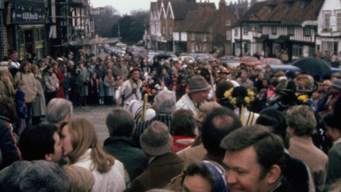 This amateur film tours rural Pinner Village during its celebratory Pinner Week festivities. The fourteenth-century parish church of St. John the Baptist is studied carefully, as are the Tudor buildings that are a prominent feature of the village. As the festival week gets underway, a young Bob Holness is seen judging the children’s fancy dress competition and there are doughnut and spaghetti eating contests.