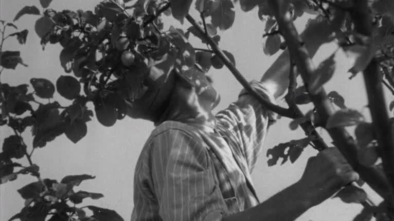 Consistency of product was the aim of this campaign to establish a brand, the National Mark, which could bypass time-consuming checks at market. The film shows the idyllic, blossoming orchards between Pershore and Evesham, where fallen petals lie like snow and the boughs are laden with luscious fruit. Following the Victorias and the Purple Pershores on their journey to auction in Worcester and on to the great market at Covent Garden, this beautifully made piece is replete with low camera angles, showing a clear influence from the best Russian filmmakers.