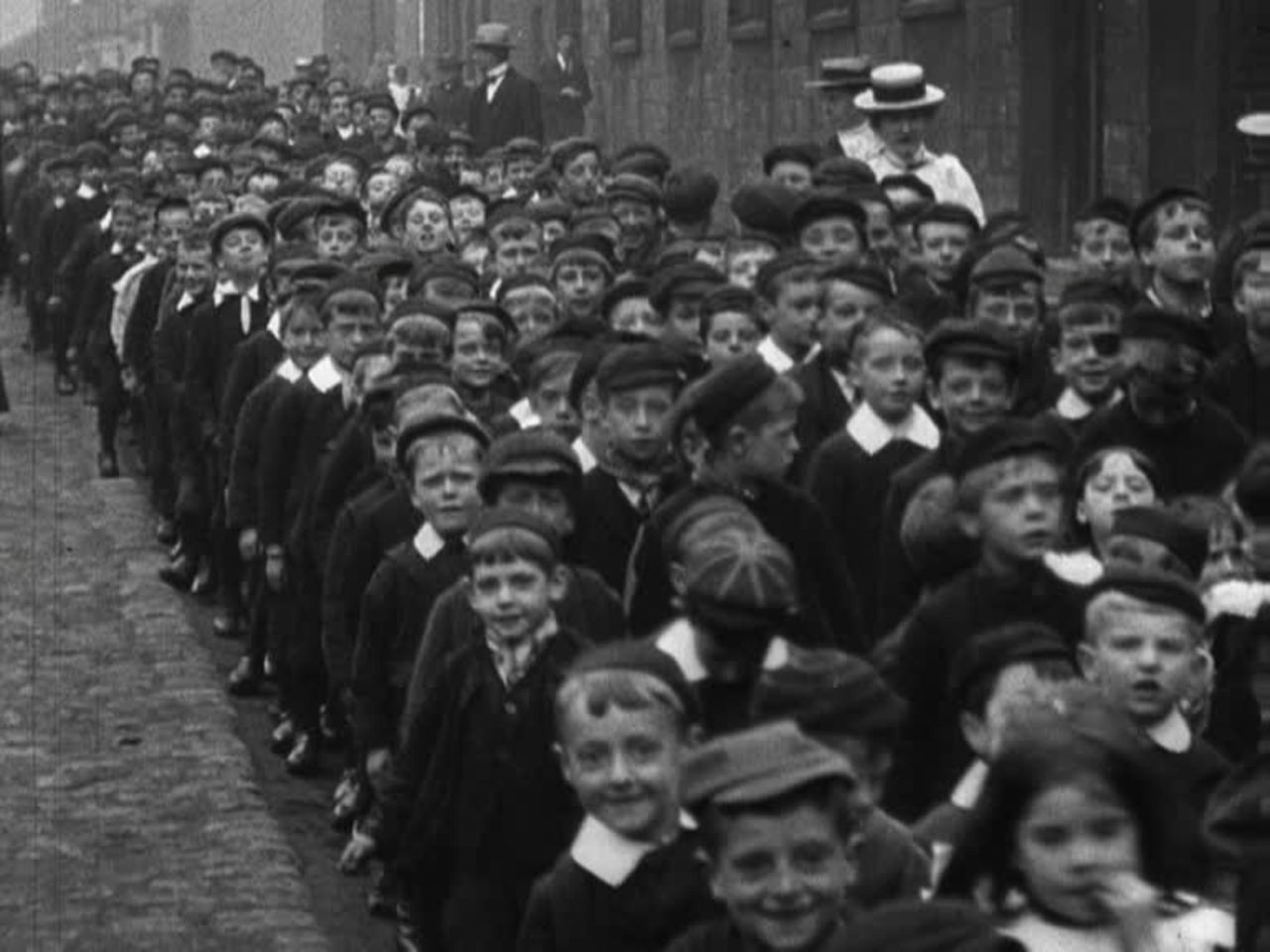 Edwardian boys and girls leave school, shuffled along by their earnest teachers.