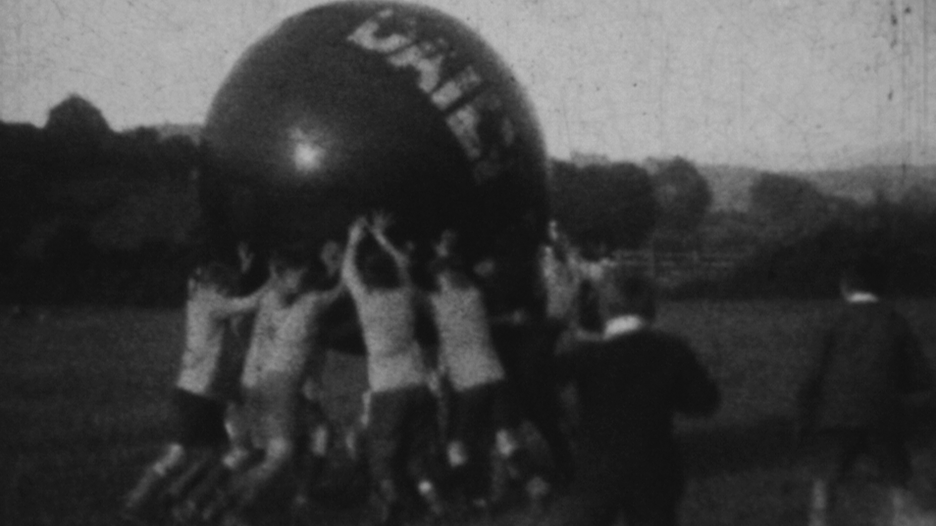 Pushball teams get stuck into their games on The Rich Field as part of Brecon’s carnival, pushing and rolling the huge airbag which advertises the ‘Daily Mail’. This ball would be hired every year by the South Wales Borderers, the town’s regiment and carnival organisers, its arrival/inflation greeted no doubt with delight. After the massive inflatable are shots of rumbustious Boy Scouts encamped on the Brecon Promenade which runs alongside the River Usk.
