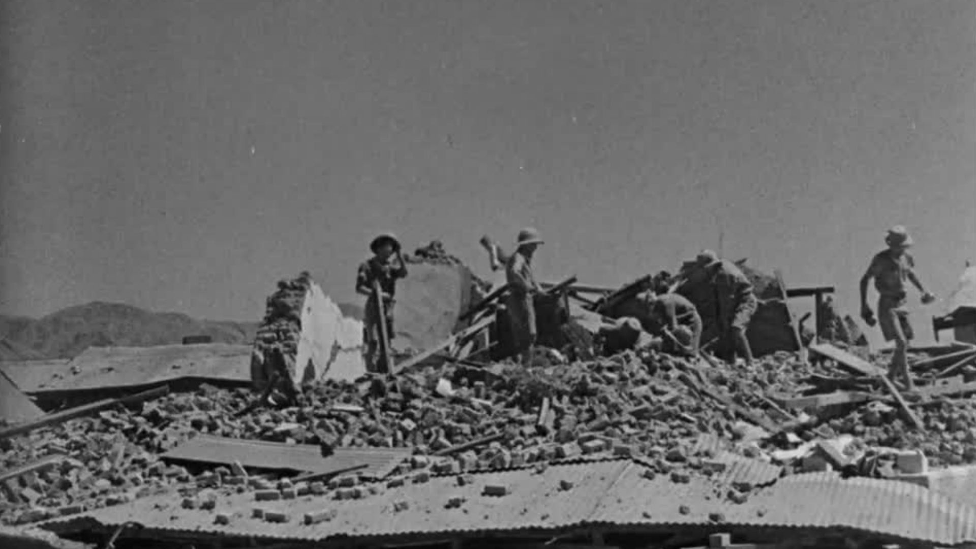 The first half of the film shows the evacuation of the city via train; a large-scale operation led by British officials ushering groups of people away from the destruction to nearby camps. The latter part of the film captures the sheer-scale of the destruction where aerial footage in particular reveals the true extent of the damage the city of Quetta had suffered.