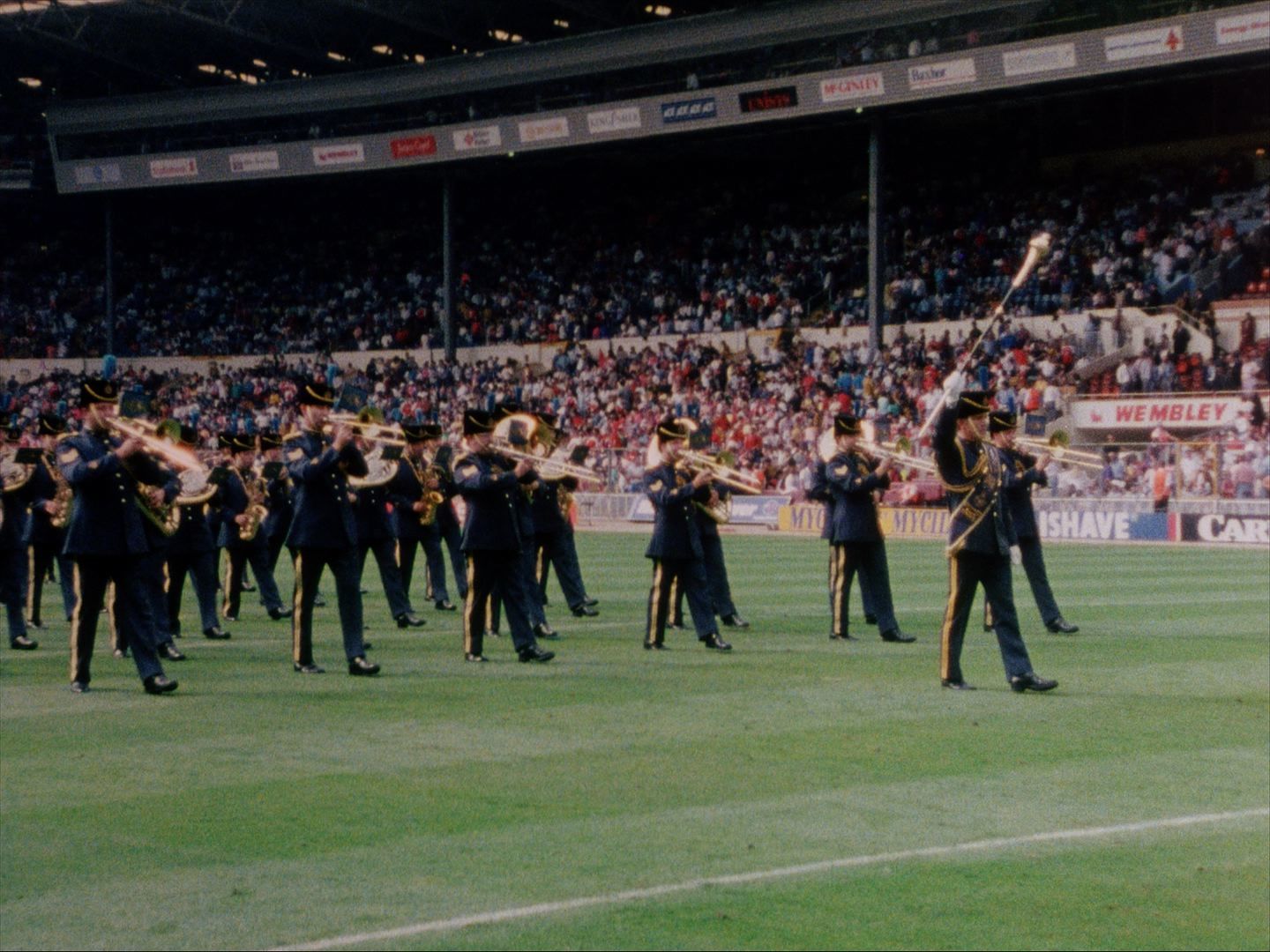 This is rough footage of the RAF marching band on the pitch at Wembley before a 1991 fixture between Arsenal and Spurs. The band are shown marching and playing, but occasionally the sound cuts out and the camera switches to the players – including Gary Lineker – warming up before the game. The band play a selection of popular themes to the crowd’s approval, who also chant players’ names.