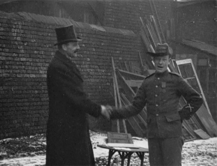 Private Charles Ward was a Leeds infantryman who returned from the Boer War a local hero, bearer of the last Victoria Cross awarded by the Queen herself. This intriguing item shows him interviewed - silent - by showman and regular Mitchell and Kenyon collaborator Ralph Pringle, who clearly saw Ward's newfound celebrity as an opportunity to attract a large paying audience of proud locals.