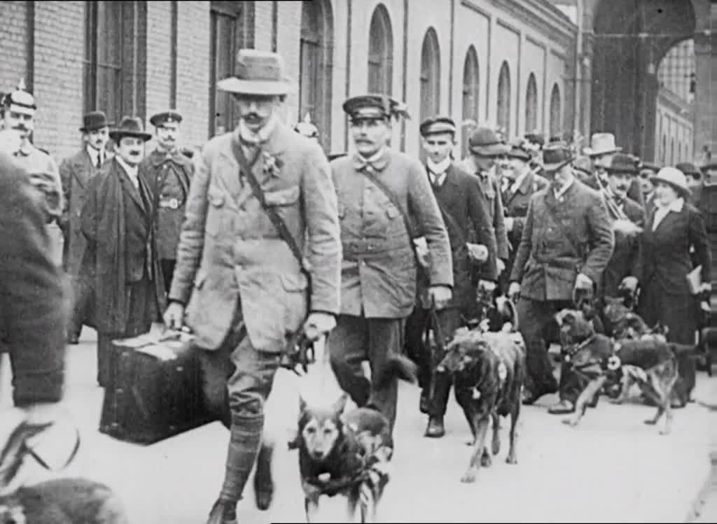 This curious Topical Budget newsreel item shows a parade of clever canines known as 'sanitatshunde' - sanitary dogs - in Germany, leaving Berlin for the Front. The hounds were specially trained to silently hunt WWI trenches and battlefields under the cover of darkness, retrieving injured servicemen. This relatively innocuous story offered British audiences a safe sortie into enemy territory.