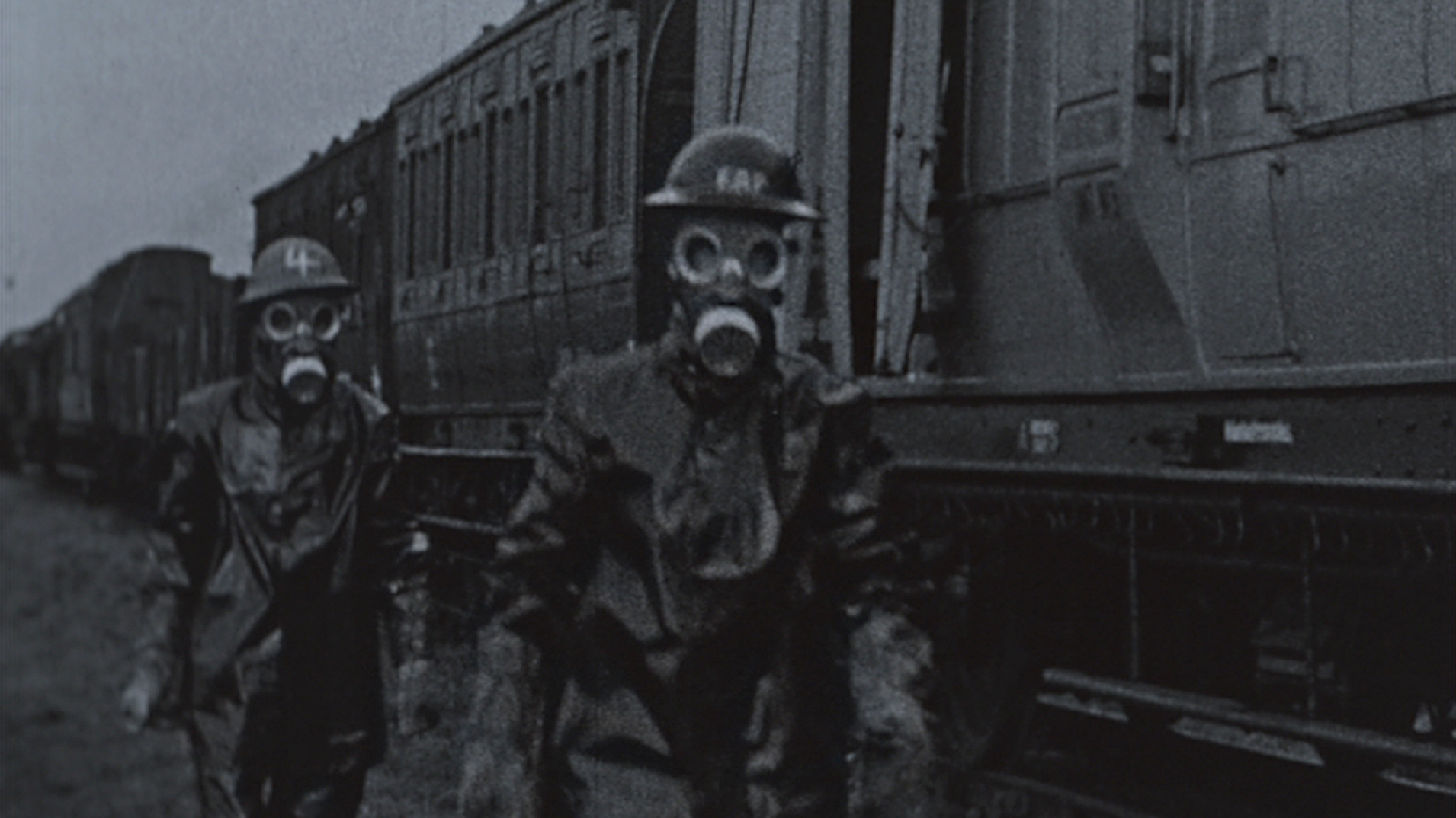 With the horrific effects of gas warfare still fresh in the memory, rubberised men – like extras from a 1950s British sci fi movie – prepare for more, with 1940s attention to detail.