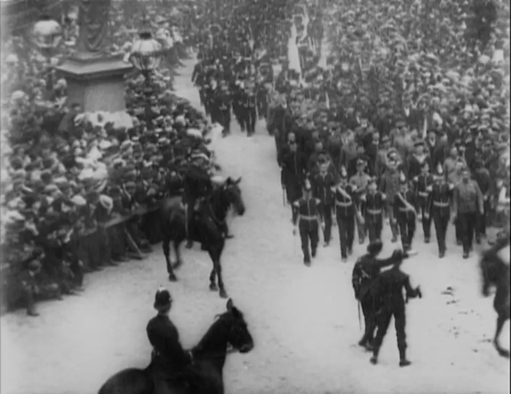 Cameras are placed at various viewpoints, some raised and others at street level, to cover soldiers from the Royal Warwickshire Regiment and their police escort marching into Birmingham's Victoria Square in May 1901. The massed crowds are largely corralled behind barriers, and some later complained about the poor views. No such problems, though, faced Mitchell and Kenyon's cameramen.