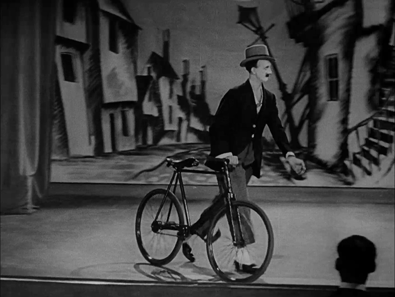 Cycling stunts and sight gags in a music hall curio.