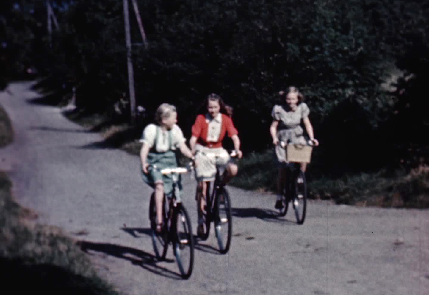 Three carefree schoolgirl cyclists learn the dangers of 'riding abreast' in this quaint cautionary tale shot in idyllic countryside.