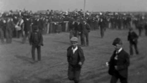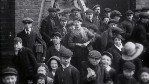 This film was shown at Stockton-on-Tees' Exchange Hall, and Mitchell & Kenyon's advertising promised "magnificent animated pictures" of "10,000 Employees Leaving Stockton Shipyards." The filmmakers typically enticed their audiences with the prospect of seeing themselves on screen and for this reason they tried to include as many people in shot as possible, though there may not be 10,000 here...