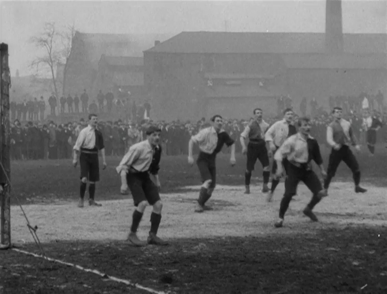These two Rotherham football clubs eventually merged to become Rotherham United in 1925. Here, they make the best of a poor pitch that caused the match to be abandoned after 55 minutes. The Rotherham Town keeper, in white, puts in a lot of effort, if not so much skill, with the ball. Showman Albert Wilkinson, in a top hat, can be seen geeing up the coal-dusted crowds for the camera.