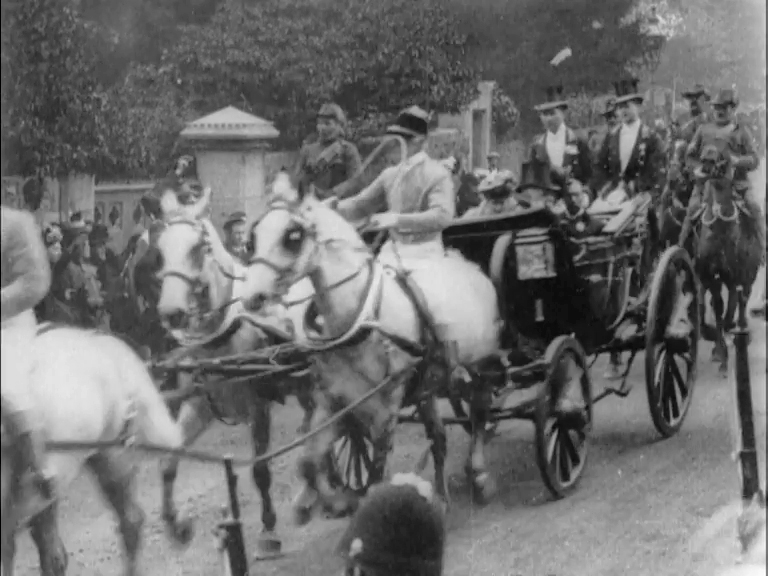 Although many carriages pass by in this film, it's clear that they are distractions before the main event. A frenzy of hankie-waving announces the arrival of George, who had assumed the title of Prince of Wales the previous November. Edward VII was already in his sixties when he took the throne, so the crowds are anxious to catch a glimpse of the man who will be their future King.