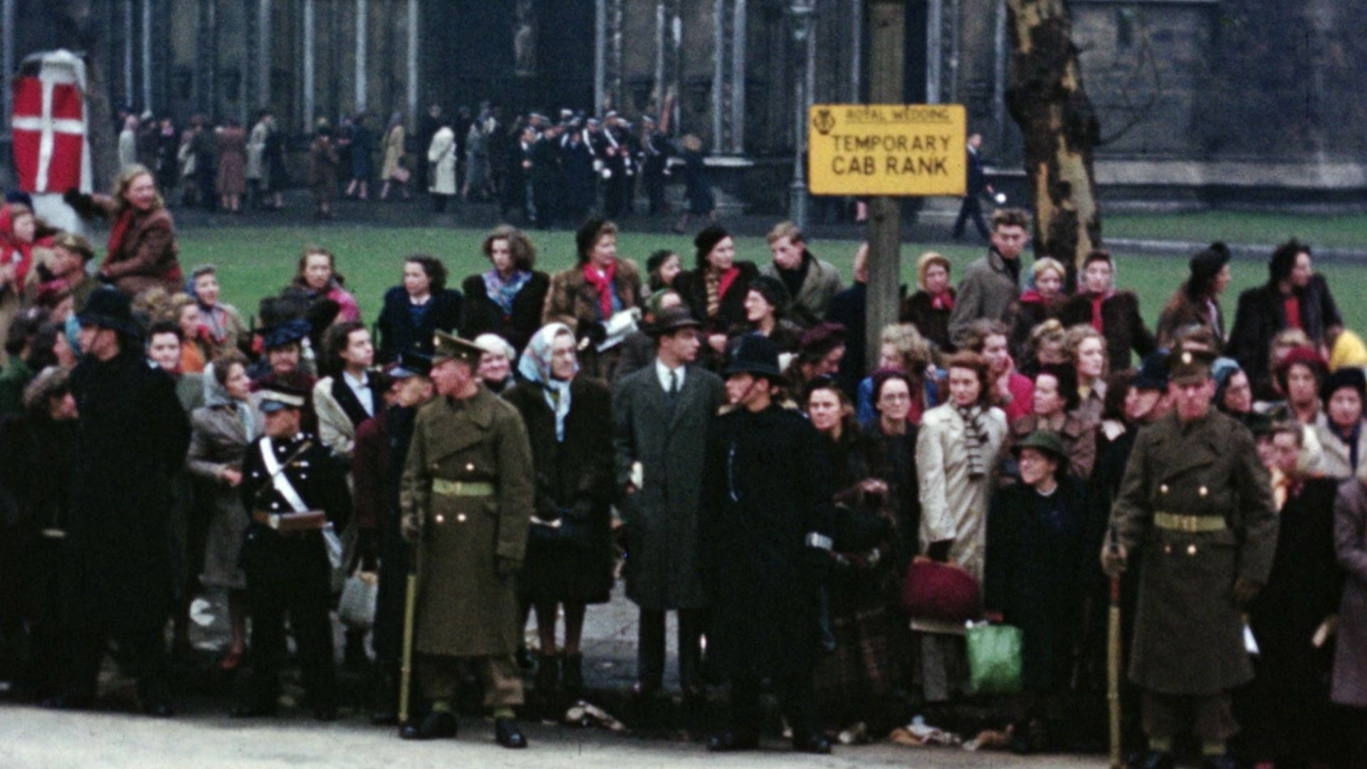 This amateur marvelous monochrome manifestation of the 1947 royal wedding was shot from within the watching crowd outside Westminster Abbey. Then, black-and-white gives way to colour: people anxiously anticipating the arrival of their sovereign, before a brief but fulfilling shot of the car carrying the people of the hour as it passes the animated assemblage. Finally, a concluding sequence capturing the expansive Abbey in its full beauty.