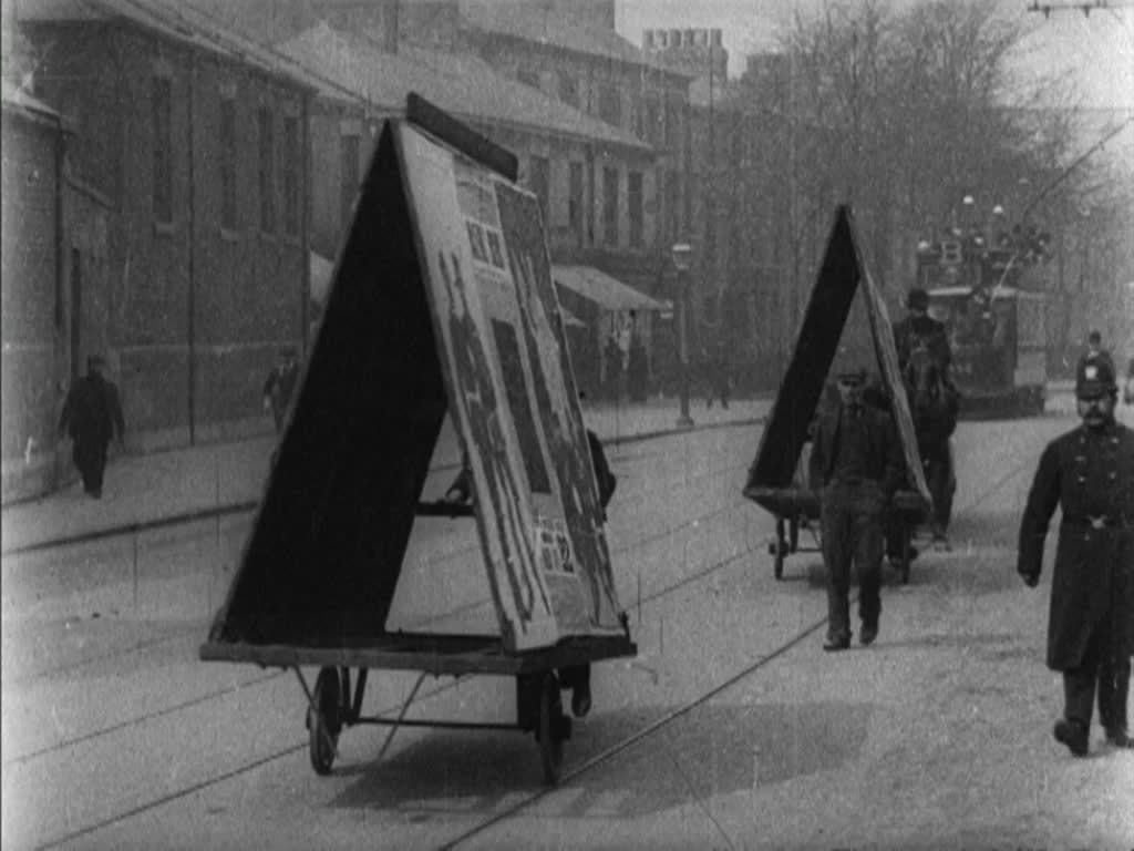 Several Mitchell and Kenyon films are oddly self-referential, capturing advertising for events where the films themselves would later be screened. These scenes flag up an event at Hull's Assembly Rooms, where Pringle's film show was running. The posters are manoeuvred around on a kind of giant mobile sandwich board, apparently promising audiences images of returning soldiers from the Boer War.