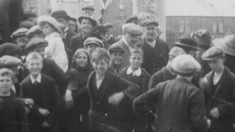 Some of Mitchell and Kenyon's 'school gate' films were more disciplined, but with these very young children the effect is much livelier, with the boys directly playing up to the camera and the girls being giggly and coquettish (aside from one at the back caught doing up her shoe). A second shot shows the over-excited children being marshalled by their teachers, but the chaotic impression remains.