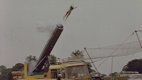 Human Cannonball Mary Connors has the guts and determination of any Olympian, proving she really is a she performing at Knebworth House, 1975.