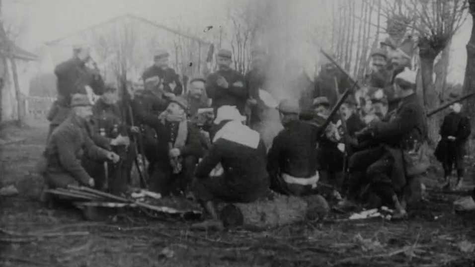 This intriguing newsreel fragment from Pathé's Animated Gazette captures a poignant moment. As a new year dawns, a band of what look like Belgian soldiers, plus a dog and a small child, enjoy a raucous campfire gathering somewhere in open countryside. Despite the circumstances, the troops refuse to have their spirits dampened, ushering in the New Year cheerily in the face of an uncertain future.