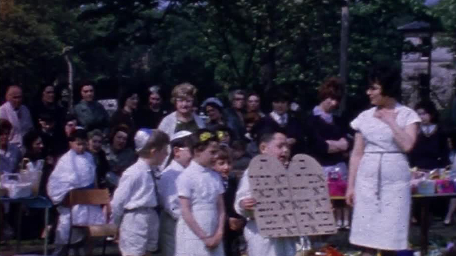 Shavuot - the Jewish Feast of Weeks - is celebrated in this delightful colour film from Manchester. Children from the King David Infant School in Cheetham Hill, assisted by older pupils from the High School, sing and carry baskets of fruit in front of a crowd on the school campus in the early summer sunshine. This is a beautifully shot record of religious observance in an educational setting.
