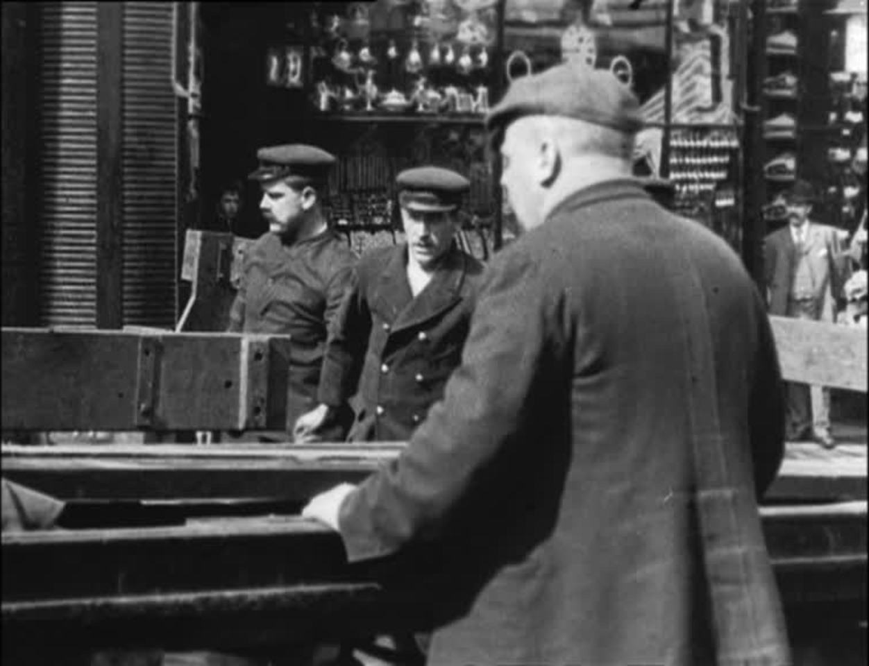 Morbid curiosity is nothing new. On a visit to Sheffield Mitchell and Kenyon's cameraman clearly stumbled on an accident near the junction of Angel Street and Market Place (now Castle Square), allowing us to see an Edwardian commotion. Men erect wooden barriers around a badly damaged shopfront, while passers by strain to see the damage - although others are more captivated by the camera.