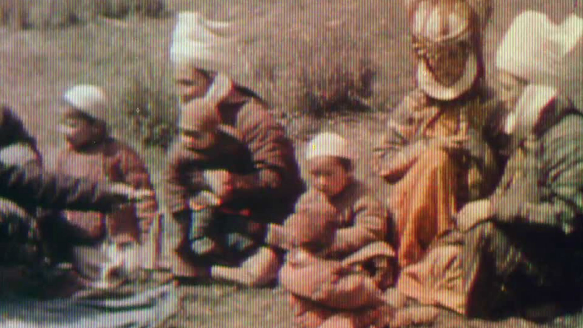 Amateur footage filmed in Kodacolour, showing people and landscapes in Sikkim / Tibet. Opens with a group of men praying then eating. Shows mountain passes and views, women working, mothers and children, family groups, people crossing a stream, village yurts, fording a river on horseback, women washing and hanging wool to dry and landscape views.