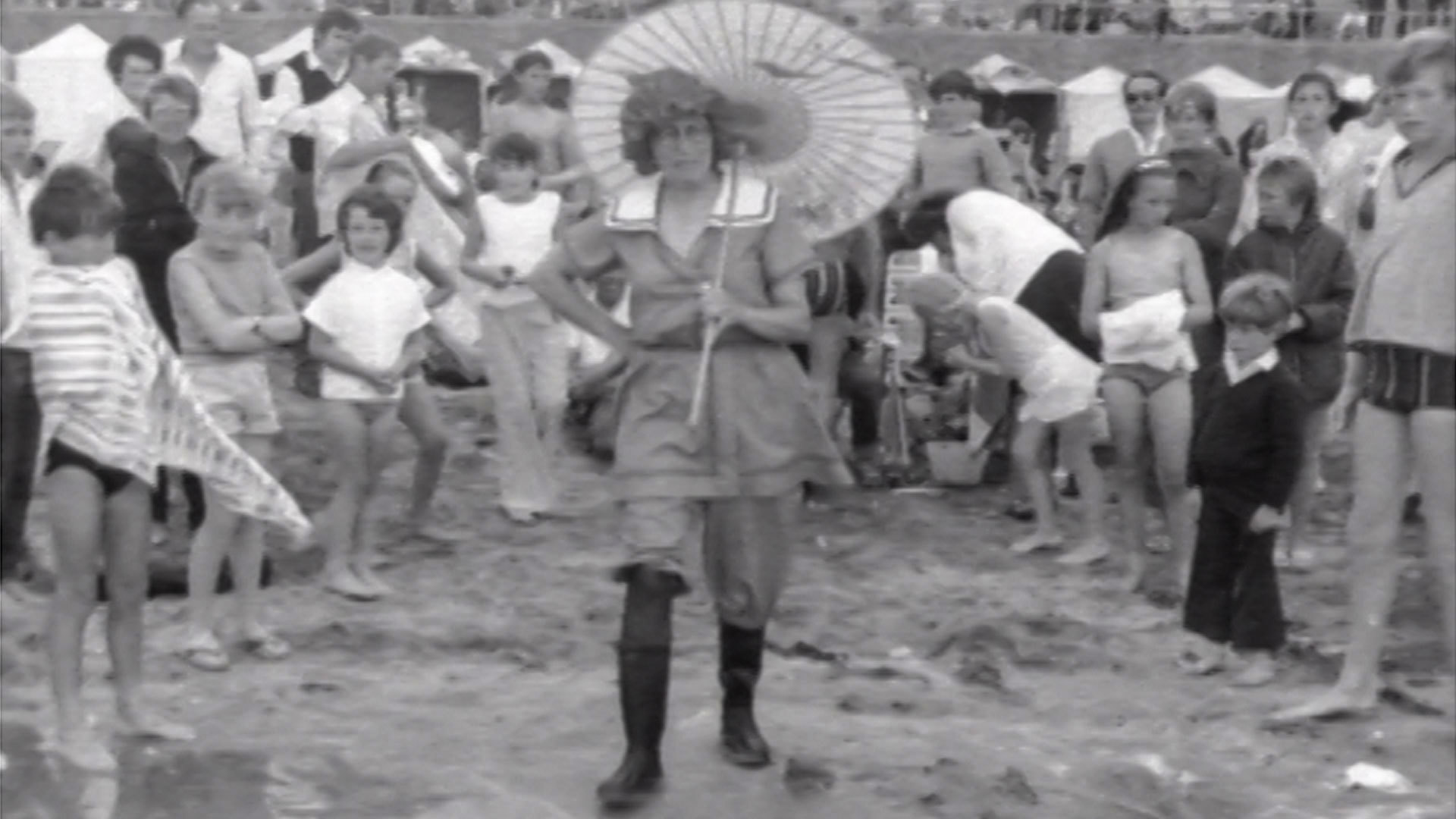 Moyra Babington stars in a sketch for Westward Diary at Looe beach, Cornwall in an aim to show the change in swimwear fashion from the early 20th century to the 1970s and the advent of the bikini. Moyra plays “Get yourself to Looe, mother” in local dialect to the amusement of the onlooking crowds on a packed seaside day out. Moyra was a popular local television personality known for her programme ‘West Country Cooking’.