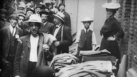 This 16mm amateur footage was filmed at the Soup Kitchen for the Jewish Poor in London's East End, and is a valuable record of a community almost vanished from this part of the capital. Located in Spitalfields on Butler Street (now Brune Street), where it moved in 1902, the soup kitchen was founded by the Jewish Board of Guardians, set up to assist Jews fleeing persecution in Eastern Europe.