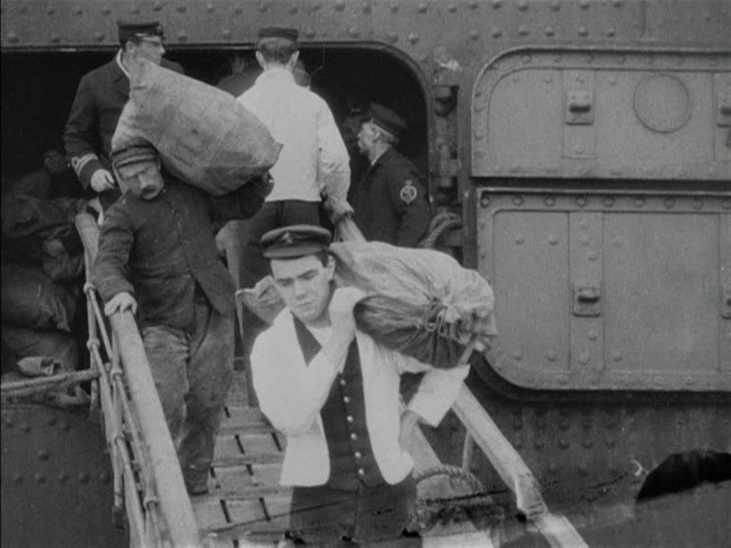 The Cunard ship SS Saxonia made her maiden voyage from Liverpool to Boston in May 1900. The passengers here would have been returning from Boston, or from Queenstown in Ireland, the only other stop. As often in Mitchell & Kenyon films, we can detect staging by the filmmaker: as the mail is unloaded, one young sailor grabs a crate marked 'fragile' and casually throws it to his mate on the quay.
