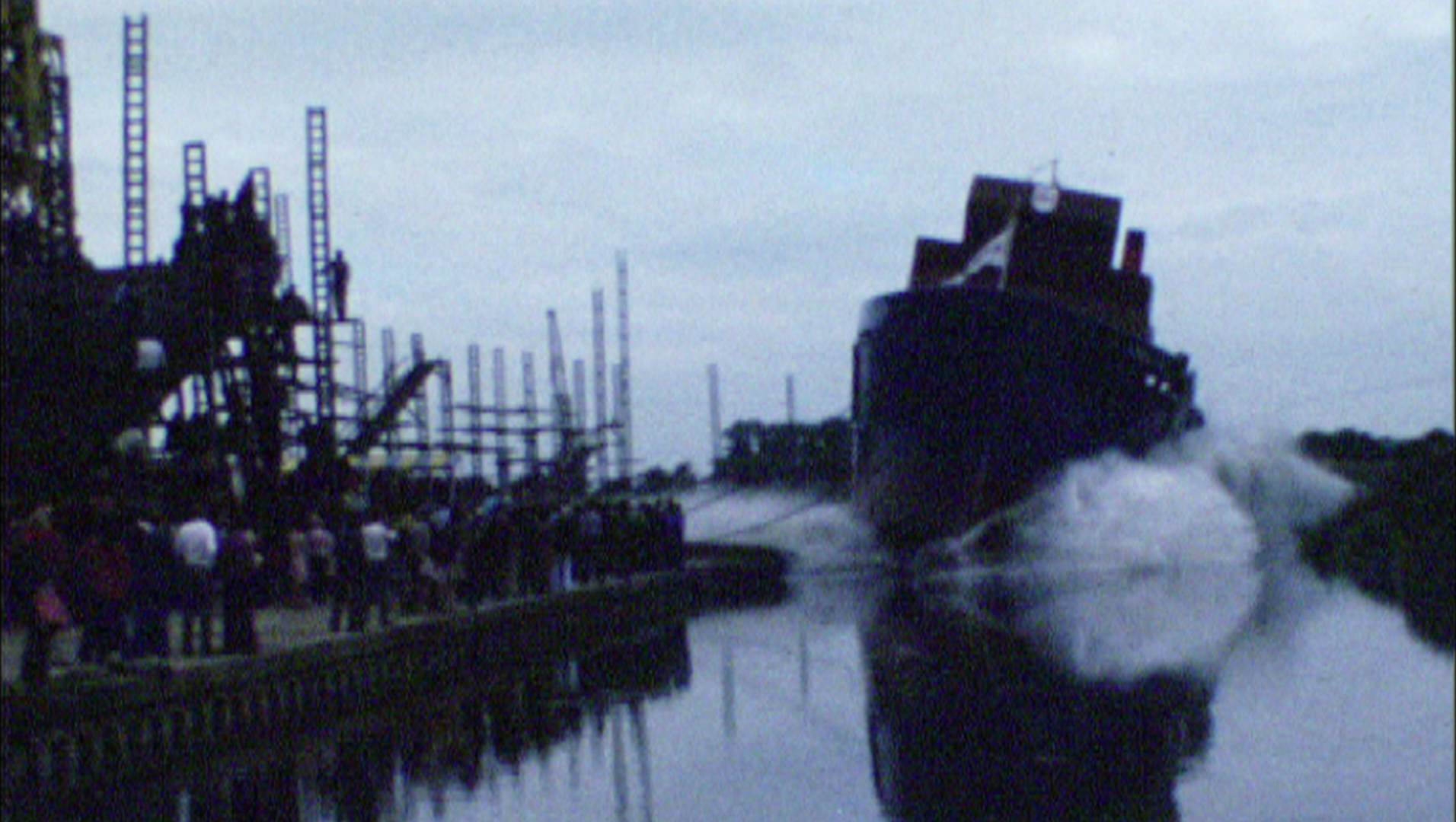 An atmospheric film of a dry dock, the welding of the hull, primitively held by timber supports, before the ship plunges sideways into a river.