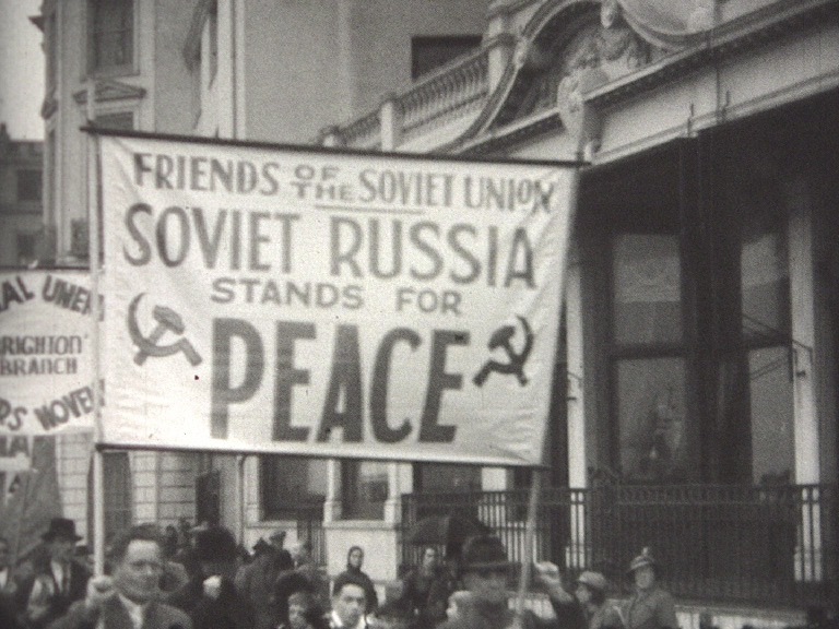 This remarkable film from 1938 shows members of the Communist Party of Sussex marching through Brighton and along the seafront. Carrying various banners, activists can also be seen handing out leaflets to passers-by. One of the marches is held to commemorate the 21st anniversary of the Russian Revolution. We also see three veterans from the Spanish Civil War return to Brighton where they march to the War Memorial and lay a wreath for their fallen comrades.