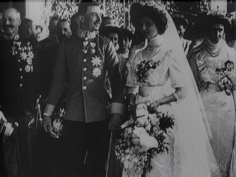 In 1914, most British people would have had little if any knowledge of who Franz Ferdinand was, so these images were offered by way of a catch-up. The footage is presented without comment, and shows two separate events: the archduke at a military review, possibly in 1913 or early 1914, and the 1911 wedding of the archduke's nephew, the future Charles I of Austria, to Princess Zita of Bourbon-Parma (with the archduke himself briefly visible among the guests). The newsreels regularly traded footage, so it's likely that these pictures weren't actually shot by one of Gaumont's cameramen - some of the same shots appeared in other European newsreels around the same time.