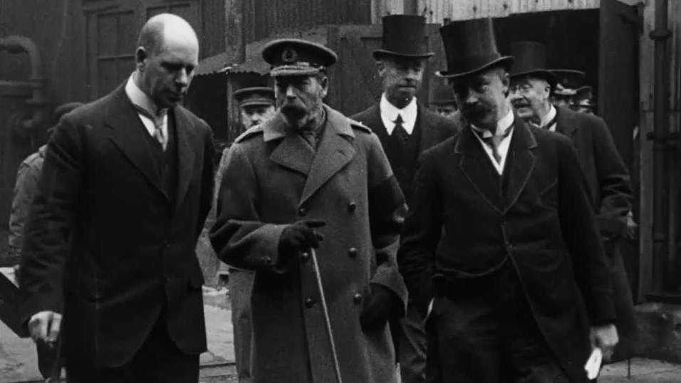Two worlds collide when George V, in a black armband, chats to workers in a factory in Acton, West London. This fascinating early footage of Britain's aviation industry also offers a glimpse of female welders and Belgian workers. The excitement of the royal visit is palpable in the expressions of the factory hands, on which the camera lingers long after the King has passed them.