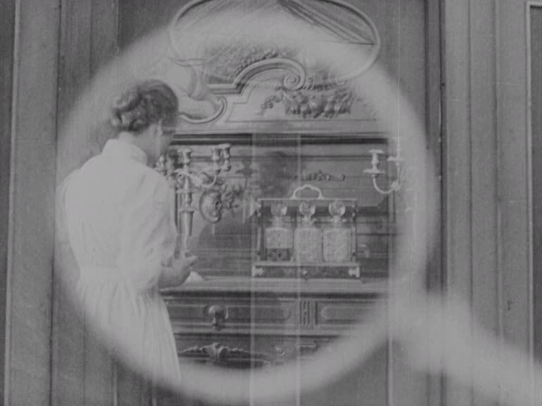 An X-ray magnifying glass? What could possibly go wrong? This story - one of numerous early films to make comic hay with mad inventions - relies on a common cinematic trick. A vignette shows the view through the magnifying glass in a 'door' or 'wall', so the inventor spies his son stealing food from the cupboard or the maid helping herself to the brandy. Inevitably the tables soon turn...