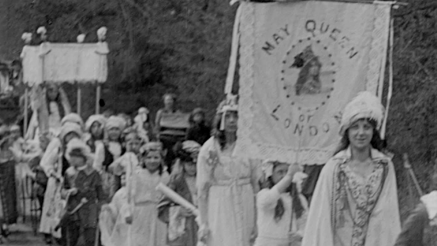 What would you miss about home if you were fighting in the trenches of WWI? For these soldiers at a spring carnival in Kent, the quaintly English spectacle of a parade of May queens is a sight for sore eyes. This brief film shows queens from London and Kent, dressed in their finery and flanked by standard bearers and fiddle players. The highlight is a "pretty incident" when one chap is so moved that he calls the floats to a halt so he can pay his respects - as a courtier would to his queen.