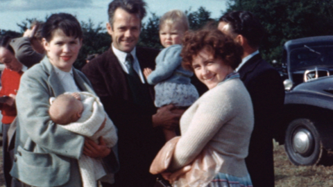 Wedding of Idris Jones of Bedlwyn farm, Treuddyn, near Mold, and Kathleen Stoddard on a cold, breezy April day at St Garmon's Church, Llanarmon-yn-Iâl. Once married, a pig makes an unexpected appearance and the bride and groom lead their guests down the church path to the Old School Room nearby where a beautifully iced, 3-tier cake awaits. They are then seen getting into a car with their bridesmaids and being driven off, a silver horseshoe hanging in the back window.
