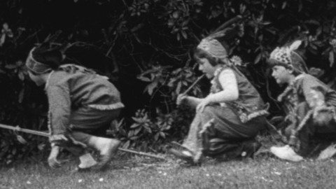 Three hardworking boys burn weeds, cut and transport reeds for an island hut on the lake at Maemawr Hall, Welshpool, and fry eggs outdoors.