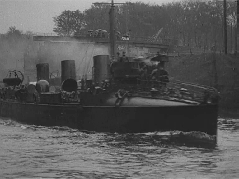Eight high speed torpedo boats and their crew visit Edwardian Manchester. The two Barton bridges over the Manchester Ship Canal open for the flotilla to pass through - these are swing bridges, one for a road, the other the only swing aqueduct in Britain carrying a canal. The torpedo boats exude raw power as they pass, observed by two camera crews, one on either side of the canal.