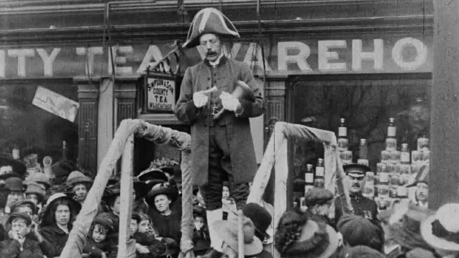 Oyez! Devizes' town crier proclaims the latest news. Tantalisingly, today's audience can only speculate on the subject matter of the announcement in this brief fragment of silent film. The film is missing its opening title, and would surely once have been far longer than these few seconds long. But at least the shop sign for 'Simpson & Son Country Tea Warehouse' hanging behind the crier allows us to identify the town as Devizes in Wiltshire.
