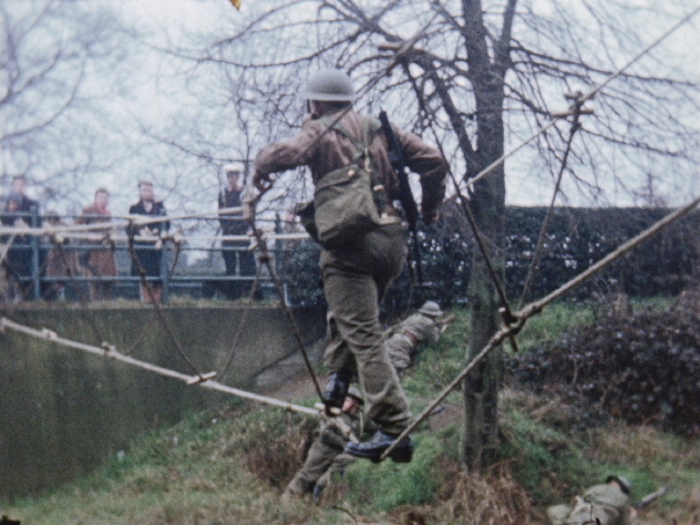 This amazing colour record of Woking's Home Guard in action shows just what was expected of them should the invader come. We see various exercises on a firing range as well as patrols along the town's streets. Explosions come thick and fast with a variety of weapons, either fired or thrown, while men cross the Basingstoke Canal on a precarious rope bridge, much to the delight of civilian spectators. The film ends with an outdoor fete and pageant for local schoolchildren.