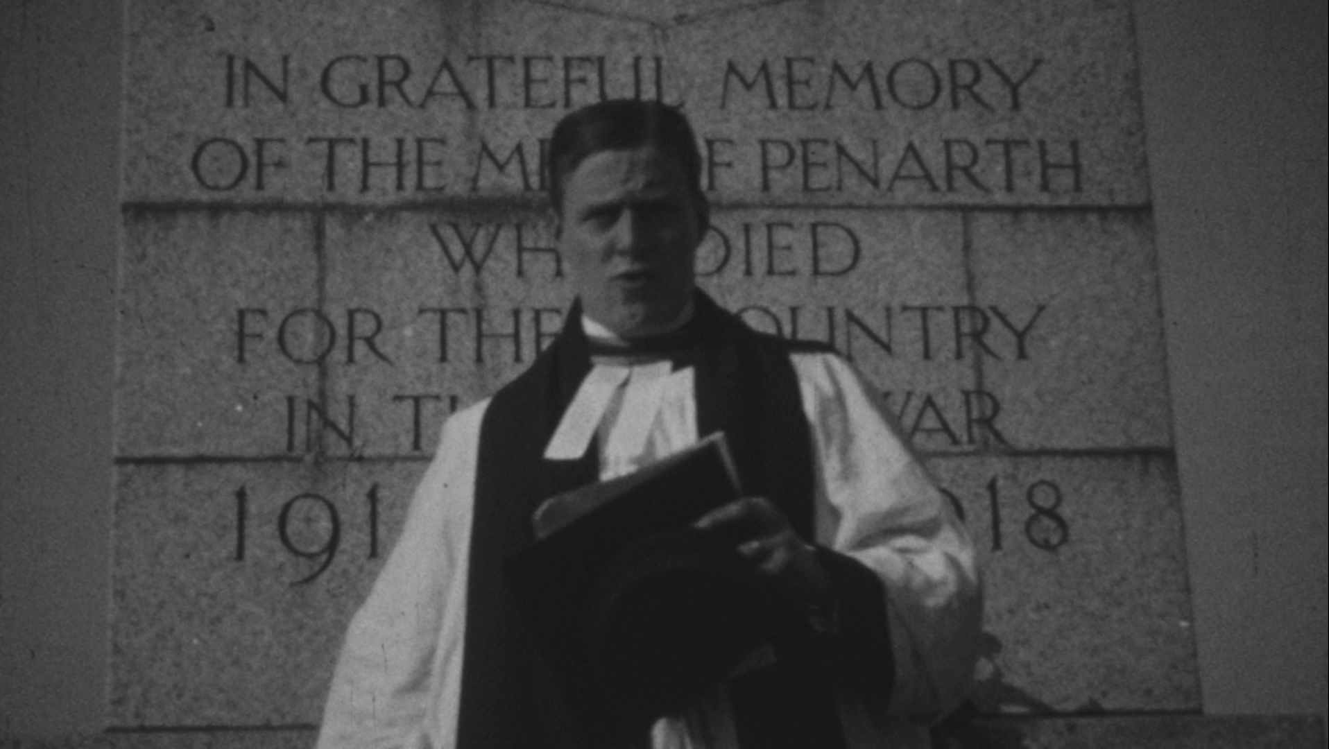This film does not catch the unveiling of the memorial by the two women who had each lost 3 sons in the Great War, but it is a record of the community’s act of remembrance on Armistic Day (11/11) 1924, and it is obviously a moving occasion. The obelisk of white granite with a bronze winged Victory figure was designed by Cardiff-born sculptor Sir William Goscombe John (1860-1952), son of a wood carver, who also suggested the memorial’s inscription.
