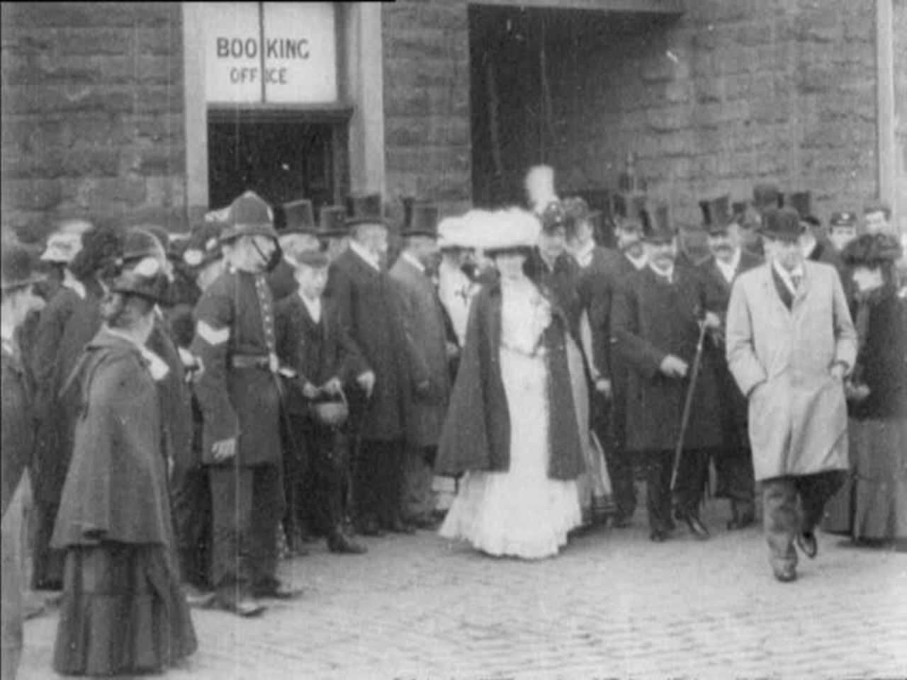 It's rare to see a Mitchell & Kenyon film where the majority of people's backs are to the camera, which is usually the main attraction. Sir George Cotton made his name, appropriately enough, as a textile mill owner in India. Back in England he was chosen as the Conservative candidate for Accrington, helping explain the well-to-do crowd greeting him here. He died in 1905, before an election.