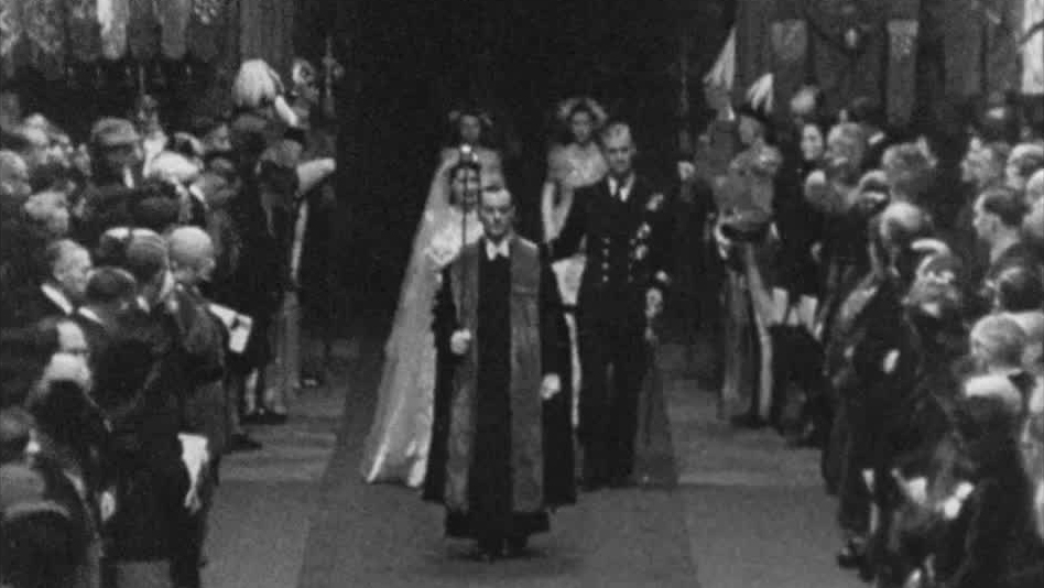 It's 20 November 1947, and Elizabeth Alexandra Mary Windsor, spinster, ties the knot with Philip Mountbatten, bachelor, in a lavish ceremony at Westminster Abbey - filmed for the benefit of cinema audiences not invited to the big do. A Mexican wave of curtsies follows the 21-year-old future queen as she glides up the aisle, followed by her parents and other dignitaries including Winston and Clementine Churchill. The whole affair is rather solemn, but the newlyweds do crack a smile at the end as they pose for the cameras.
