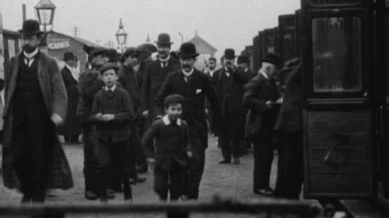 In its subject but also in its composition, this film, like several others in the Mitchell and Kenyon collection, clearly evokes what is considered the very first cinematograph film, the Lumiere Brothers' L'Arrivée d'un train à la Ciotat (The Arrival of a Train, France, 1895). The train service was run by Dublin, Wicklow & Wexford Railway Company. Wexford Station opened in 1874 and still has a single platform. The largely well-to-do passengers seen here contrast sharply with the more humbly-dressed townspeople seen in another film shot by De Clercq during his Wexford visit, Life in Wexford. De Clerq's own diary tells us that he stayed in Wexford on 18 and 19 January 1902. The images in both Wexford films attest to the truth in his complaint about the 'very poor light' for filming. De Clercq ultimately chose to stay in Ireland, working for a new filmmaking venture set up by journalist and printer James T. Jameson.