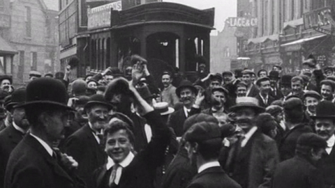 A rich assortment of transport is on display in this busy Edwardian street, including a hand-pushed cart, elegant horses pulling dainty two-wheel carriages and a much more workaday cart carrying a live cow - not forgetting the imposing steam-powered trams. There's a striking absence of women, though a handful of girls linger among the groups of lads on the look-out for excitement.