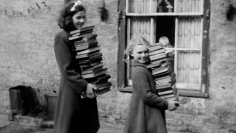 Lines of children laden with books deliver them to bespectacled gentlemen granted the right to select those to be sent to forces abroad, and those to be pulped for recycling.