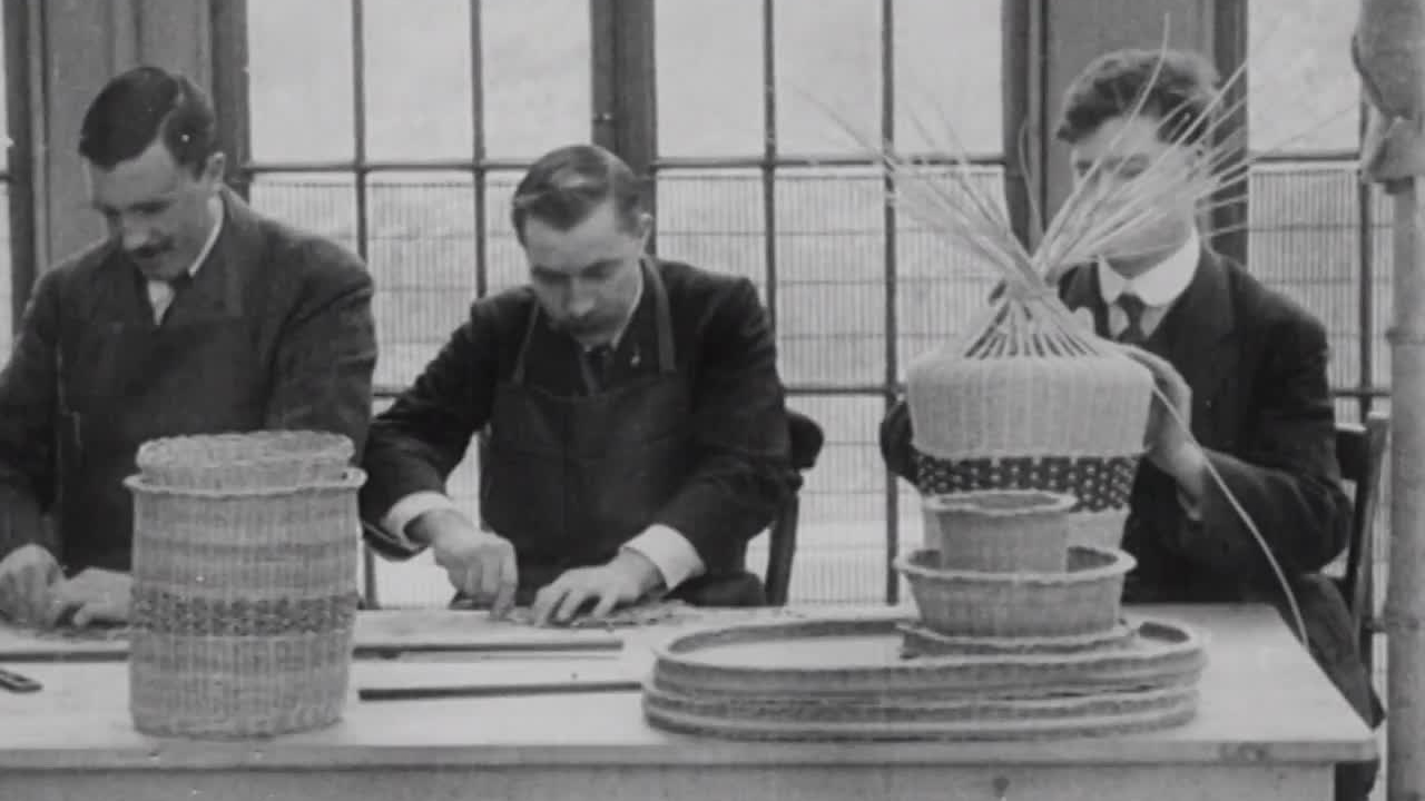 Boot-mending and basket-making are among the activities on offer at St. Dunstan’s hostel for blind soldiers in Regent’s Park. The ex-servicemen were provided retraining in various professions, including joinery and gardening, from instructors who were often blind themselves. The programme was intended to help soldiers adapt to their blindness, advocating an ethos of self-reliance that prepared them for future employment opportunities.