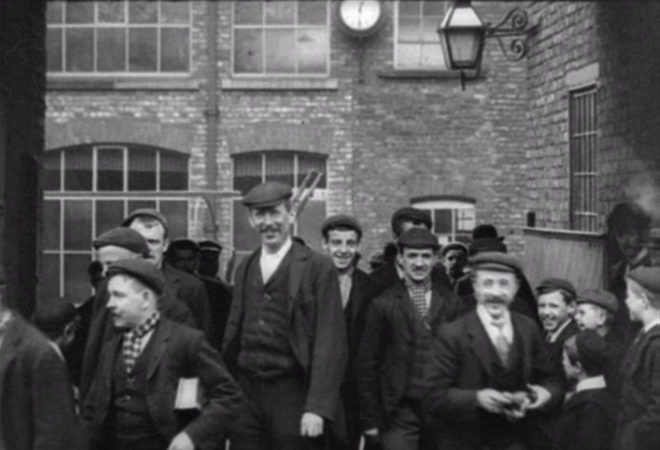 Judging by the range of expressions, being filmed leaving work was either a welcome diversion or an unwanted intrusion for these work-weary Lancastrians. The film was shot in advance of a Middleton 'wakes' holiday, when the film would have been exhibited at a travelling cinematograph stand. The Middleton-based Dickens & Heywood mill specialised in the manufacture of polished yarns.