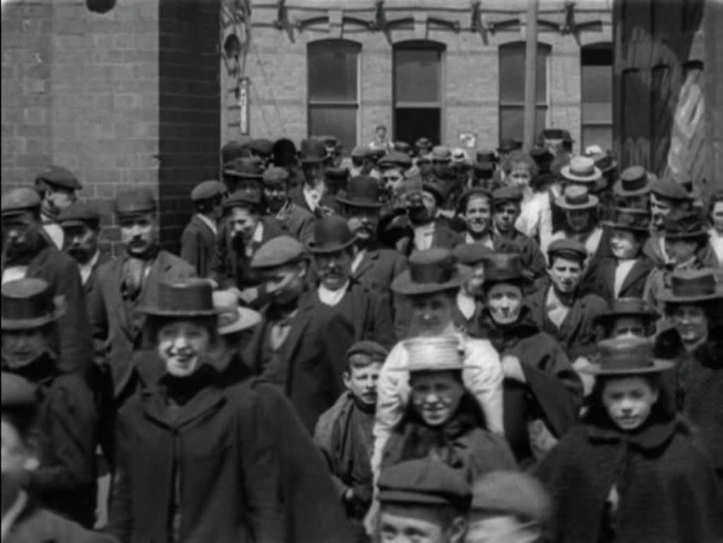 Most of Mitchell and Kenyon's 'factory gates' films are quite simple affairs: typically one or two shots. This unusual example, spread over two rolls of film, has familiar images of exiting workers and cheery kids framed by establishing shots and set pieces with the bosses, who clearly took a close interest in the film as a badge of status. The extra detail makes this a particularly rich portrait.