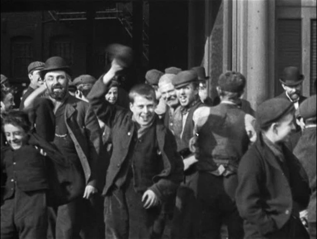 Victorian Manchester mill workers enjoy the novelty of a moving picture camera.