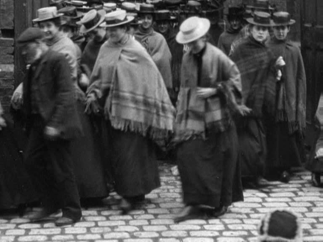 Patricroft, then in Lancashire (now in Greater Manchester), was a key inspiration for Friedrich Engels' book The Conditions of the Working Class in England, which highlighted the dreadful conditions of the working class in the mid-19th century. Some 50 years later, these workers look cheerful as they stream through the gates of an unidentified factory.
