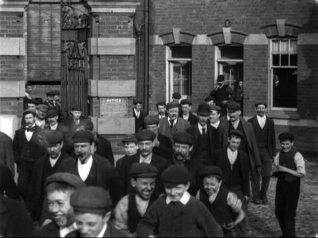 Filmed in November 1900, this footage was shown at that month's Loughborough town fair. (On the same trip, Mitchell and Kenyon filmed the Cartwright & Warner hosiery works.) Among the duo's 'factory gate' films, this one stands out for its composition, and for the relatively wealthy, well-dressed, well-behaved male crowd steadily snaking past the gate. Note also the profusion of bicycles.